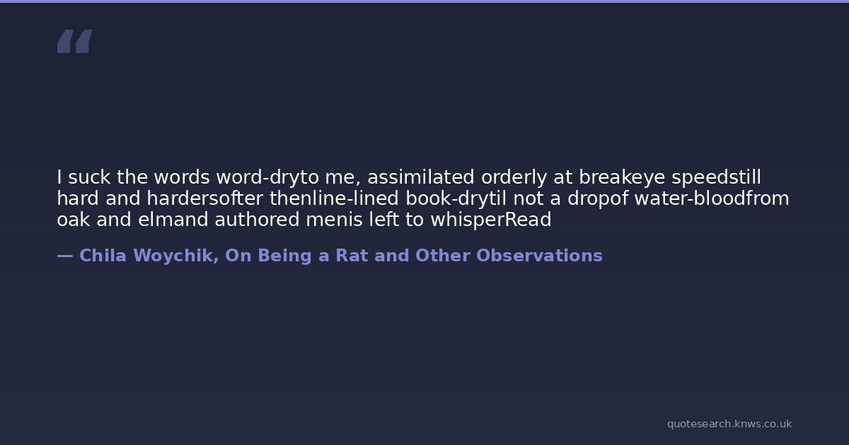 I suck the words word-dryto me, assimilated orderly at breakeye speedstill hard and hardersofter thenline-lined book-drytil not a dropof water-bloodfrom oak and elmand authored menis left to whisperRead