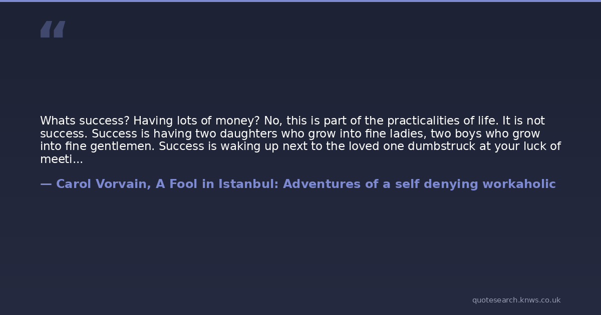 Whats success? Having lots of money? No, this is part of the practicalities of life. It is not success. Success is having two daughters who grow into fine ladies, two boys who grow into fine gentlemen. Success is waking up next to the loved one dumbstruck at your luck of meeting them.