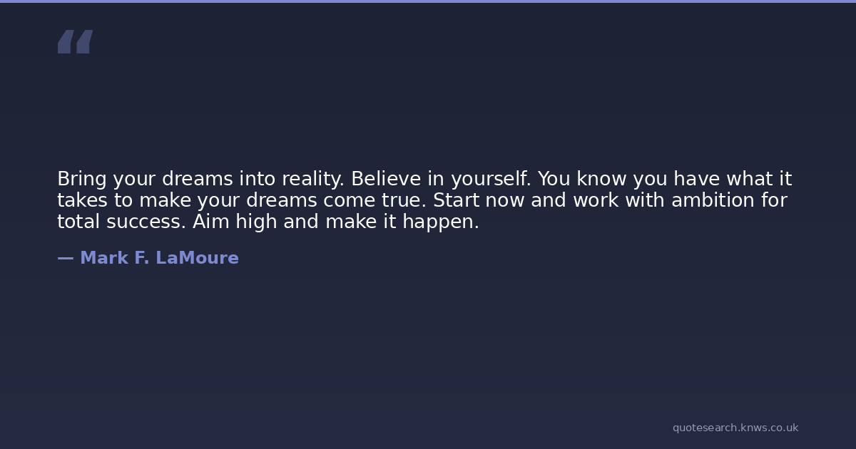 Bring your dreams into reality. Believe in yourself. You know you have what it takes to make your dreams come true. Start now and work with ambition for total success. Aim high and make it happen.