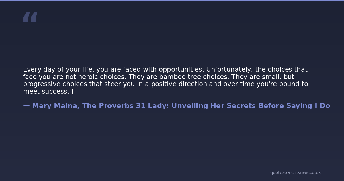 Every day of your life, you are faced with opportunities. Unfortunately, the choices that face you are not heroic choices. They are bamboo tree choices. They are small, but progressive choices that steer you in a positive direction and over time you're bound to meet success. For most of us, we spend all our lives waiting for that life changing moment that will change the course of our lives and make us successful. Unfortunately, the clock is ticking. Every day, we choose not to tend to our bamboo tree, a choice is made for us and by the time we realize it, the seasons have passed and we have nothing to show for it.