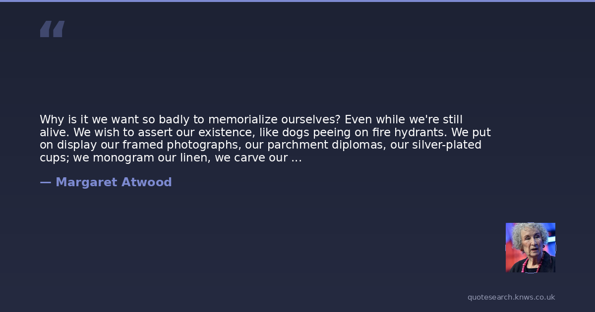 Why is it we want so badly to memorialize ourselves? Even while we're still alive. We wish to assert our existence, like dogs peeing on fire hydrants. We put on display our framed photographs, our parchment diplomas, our silver-plated cups; we monogram our linen, we carve our names on trees, we scrawl them on washroom walls. It's all the same impulse. What do we hope from it? Applause, envy, respect? Or simply attention, of any kind we can get?At the very least we want a witness. We can't stand the idea of our own voices falling silent finally, like a radio running down.