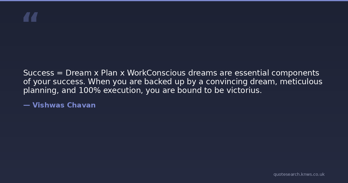 Success = Dream x Plan x WorkConscious dreams are essential components of your success. When you are backed up by a convincing dream, meticulous planning, and 100% execution, you are bound to be victorius.