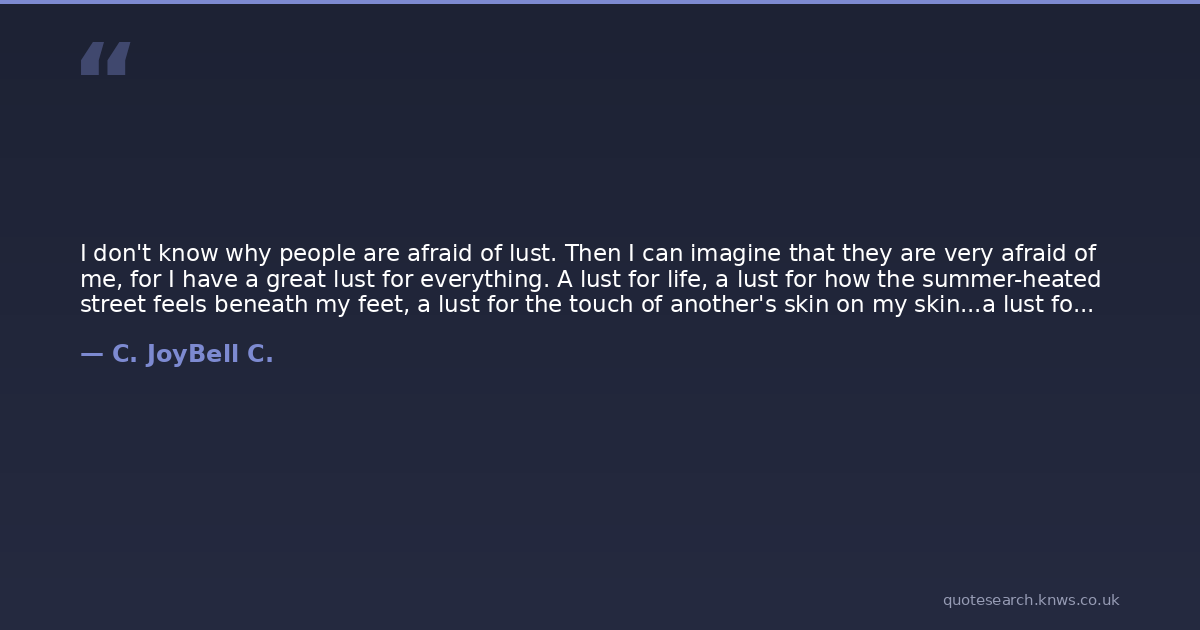 I don't know why people are afraid of lust. Then I can imagine that they are very afraid of me, for I have a great lust for everything. A lust for life, a lust for how the summer-heated street feels beneath my feet, a lust for the touch of another's skin on my skin...a lust for everything. I even lust after cake. Yes, I am very lusty and very scary.