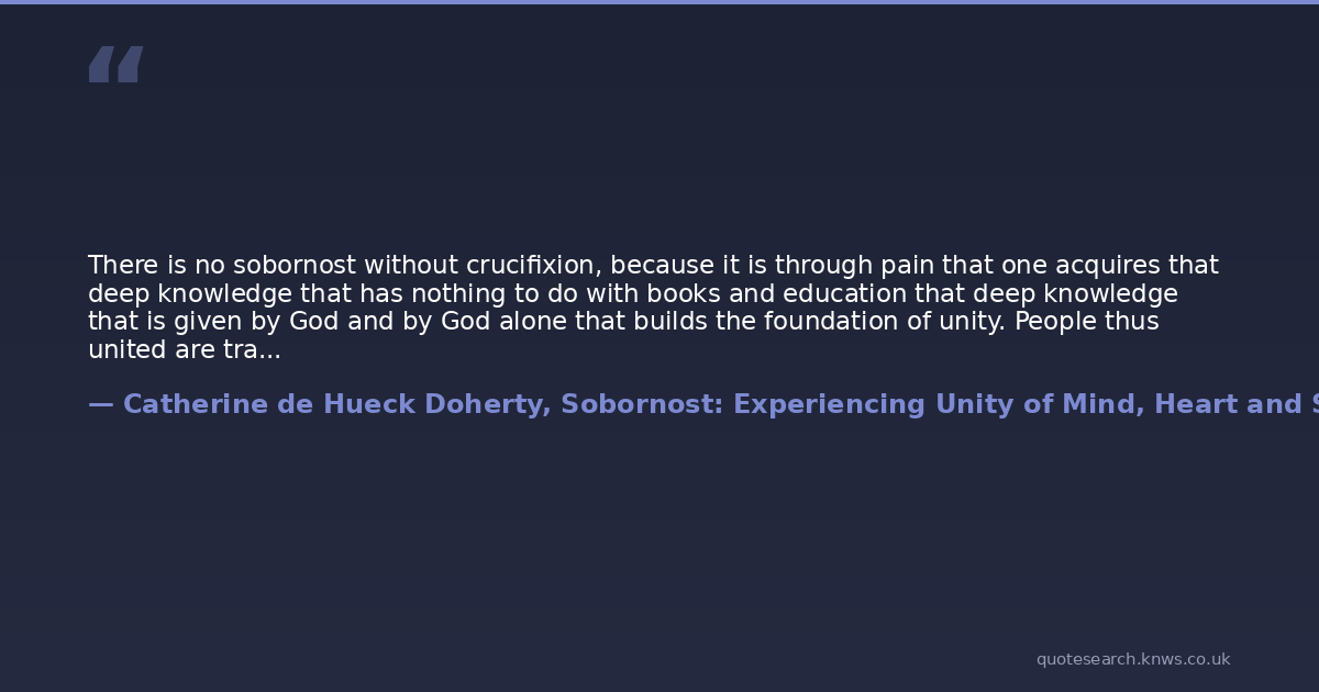 There is no sobornost without crucifixion, because it is through pain that one acquires that deep knowledge that has nothing to do with books and education that deep knowledge that is given by God and by God alone that builds the foundation of unity. People thus united are transparent, and it is in those depths that one finds, I repeat, the foundation of sobornost of unity.