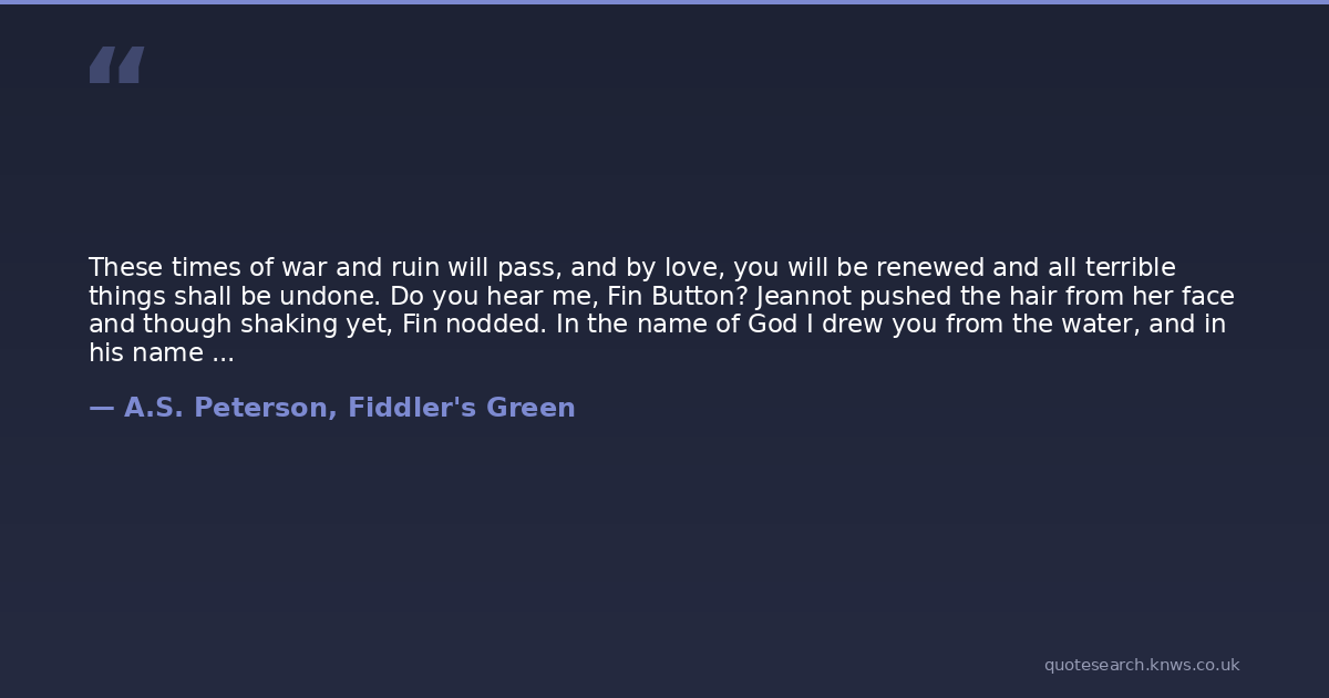 These times of war and ruin will pass, and by love, you will be renewed and all terrible things shall be undone. Do you hear me, Fin Button? Jeannot pushed the hair from her face and though shaking yet, Fin nodded. In the name of God I drew you from the water, and in his name shall you be delivered home.