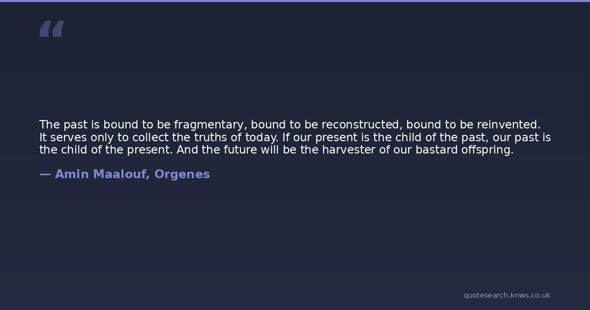 The past is bound to be fragmentary, bound to be reconstructed, bound to be reinvented. It serves only to collect the truths of today. If our present is the child of the past, our past is the child of the present. And the future will be the harvester of our bastard offspring.