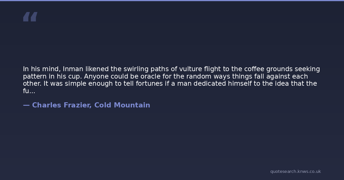In his mind, Inman likened the swirling paths of vulture flight to the coffee grounds seeking pattern in his cup. Anyone could be oracle for the random ways things fall against each other. It was simple enough to tell fortunes if a man dedicated himself to the idea that the future will inevitably be worse than the past and that time is a path leading nowhere but a place of deep and persistent threat. The way Inman saw it, if a thing like Fredericksburg was to be used as a marker of current position, then many years hence, at the rate we're going, we'll be eating one another raw.
