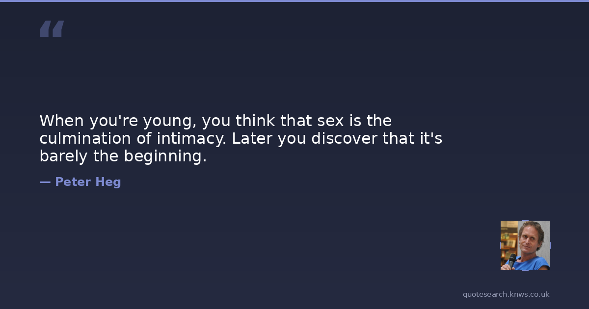 Peter Heg was a contemporary Danish writer of fiction. Peter Høeg is a Danish writer of fiction. He is best known for his novel Miss Smilla's Feeling for Snow (1992). Read more on Wikipedia →