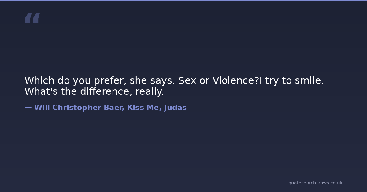 Which do you prefer, she says. Sex or Violence?I try to smile. What's the difference, really. indifference sex violence Download Image Share on X Share on Facebook Copy Link