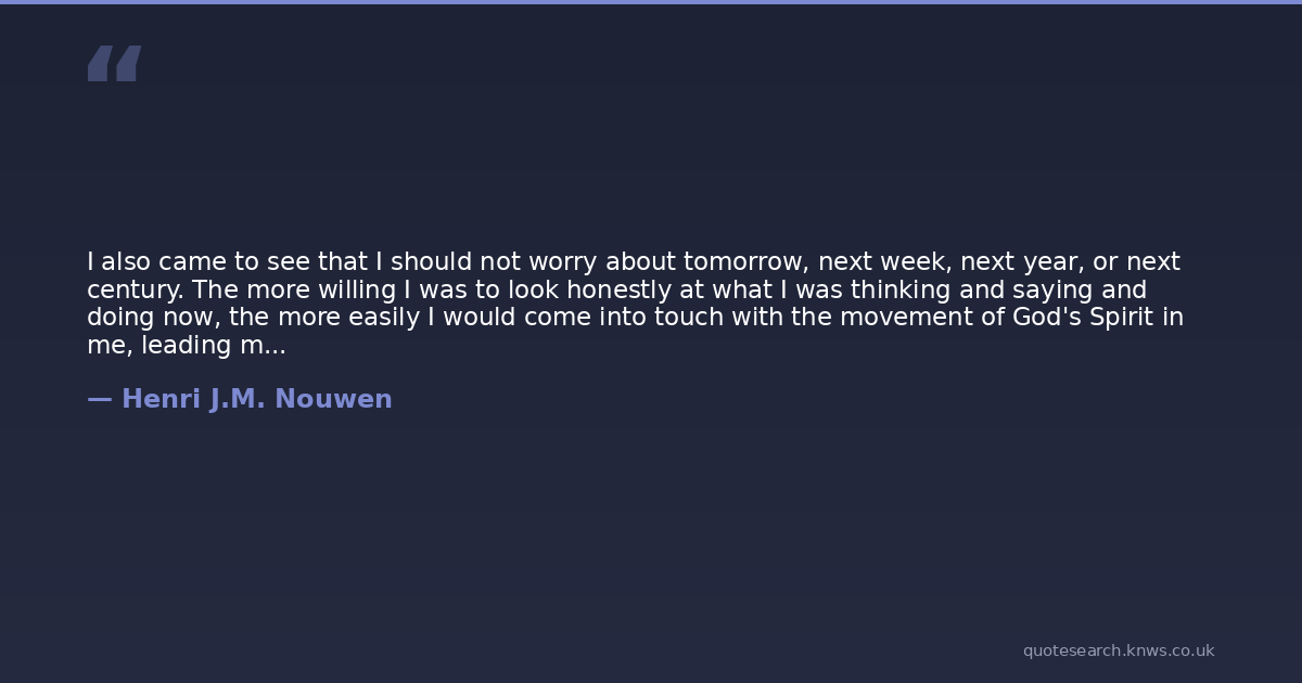 I also came to see that I should not worry about tomorrow, next week, next year, or next century. The more willing I was to look honestly at what I was thinking and saying and doing now, the more easily I would come into touch with the movement of God's Spirit in me, leading me to the future. God is a God of the present and reveals to those who are willing to listen carefully to the moment in which they live the steps they are to take toward the future. "Do not worry about tomorrow," Jesus says, "tomorrow will take care of itself. Each day has enough trouble of its own" (Matthew 6:34).
