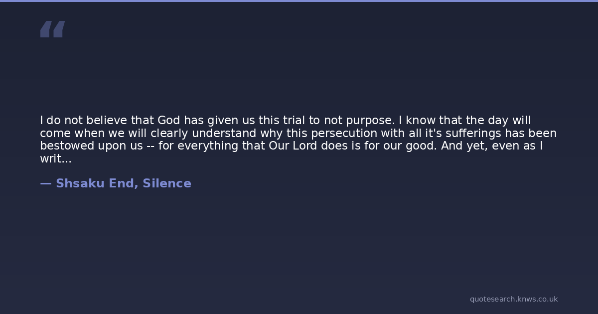 I do not believe that God has given us this trial to not purpose. I know that the day will come when we will clearly understand why this persecution with all it's sufferings has been bestowed upon us -- for everything that Our Lord does is for our good. And yet, even as I write these words I feel the oppressive weight in my heart of those last stammering words of Kichijiro in the morning of his departure: "Why has Deus Sama imposed this suffering on us?" and then the resentment in those eyes that he turned upon me. "Father", he had said "what evil have we done?"I suppose I should simply cast from my mind these meaningless words of the coward; yet why does his plaintive voice pierce my breast with tall the pain of a sharp needle? Why has Our Lord imposed this torture and this persecution on poor Japanese peasants? No, Kichijiro was trying to express something different, something even more sickening. The silence of God. Already twenty years have passed since the persecution broke out; the black soil of Japan has been filled with the lament of so many Christians; the red blood of priests has flowed profusely; the walls of churches have fallen down; and in the face of this terrible and merciless sacrifice offered up to Him, God has remained silent.