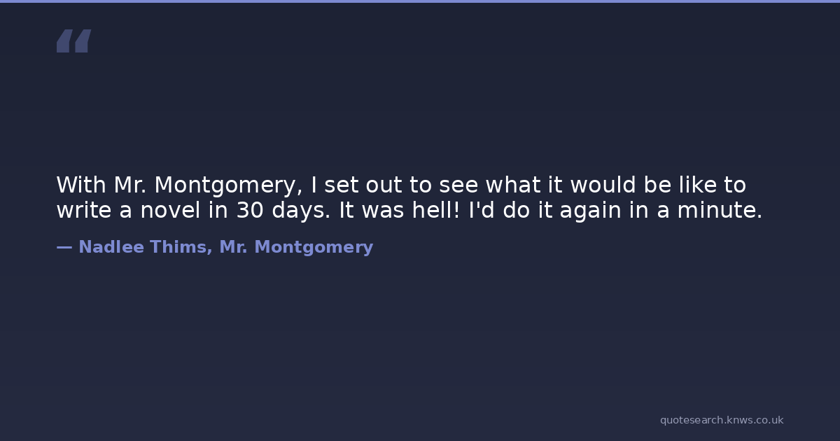 With Mr. Montgomery, I set out to see what it would be like to write a novel in 30 days. It was hell! I'd do it again in a minute.