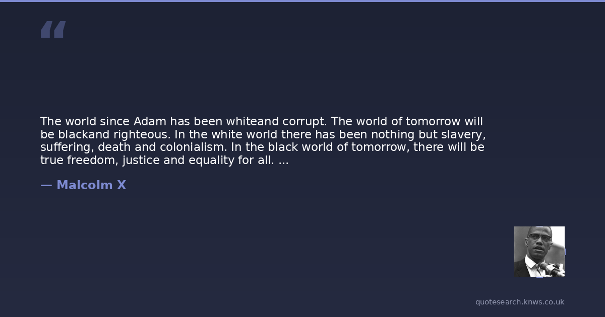 The world since Adam has been whiteand corrupt. The world of tomorrow will be blackand righteous. In the white world there has been nothing but slavery, suffering, death and colonialism. In the black world of tomorrow, there will be true freedom, justice and equality for all. And that day is comingsooner than you think.