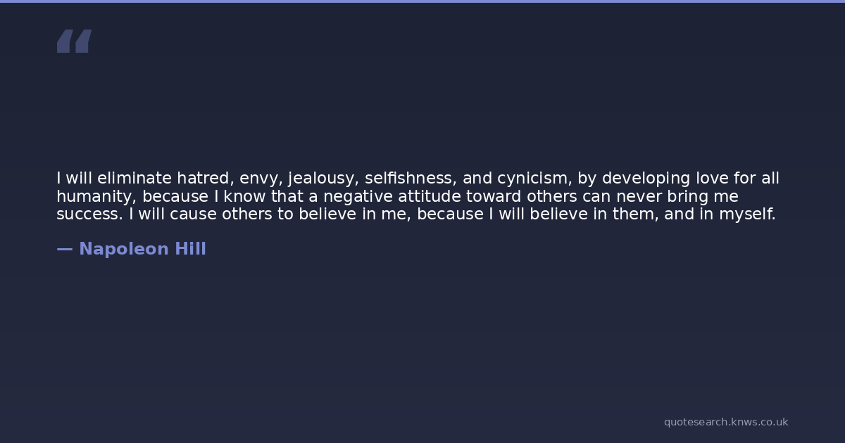 I will eliminate hatred, envy, jealousy, selfishness, and cynicism, by developing love for all humanity, because I know that a negative attitude toward others can never bring me success. I will cause others to believe in me, because I will believe in them, and in myself.