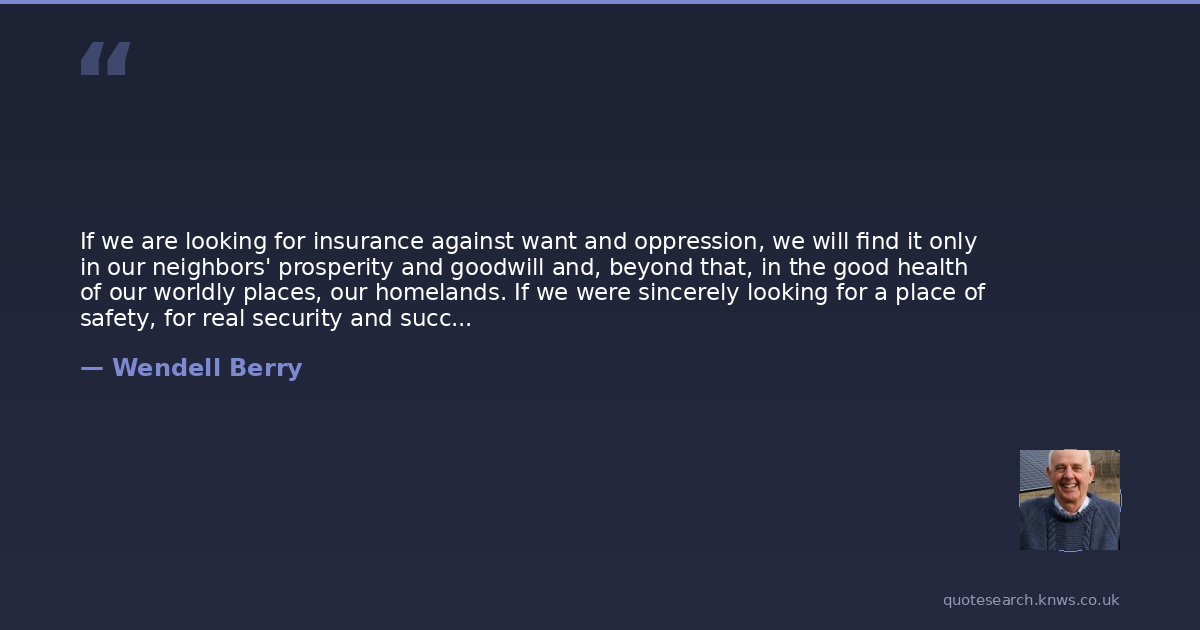 If we are looking for insurance against want and oppression, we will find it only in our neighbors' prosperity and goodwill and, beyond that, in the good health of our worldly places, our homelands. If we were sincerely looking for a place of safety, for real security and success, then we would begin to turn to our communities - and not the communities simply of our human neighbors but also of the water, earth, and air, the plants and animals, all the creatures with whom our local life is shared.(pg. 59, "Racism and the Economy")