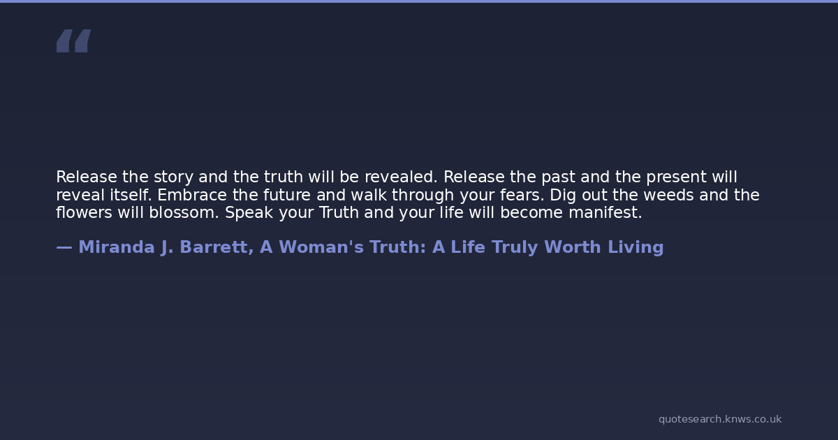Release the story and the truth will be revealed. Release the past and the present will reveal itself. Embrace the future and walk through your fears. Dig out the weeds and the flowers will blossom. Speak your Truth and your life will become manifest.