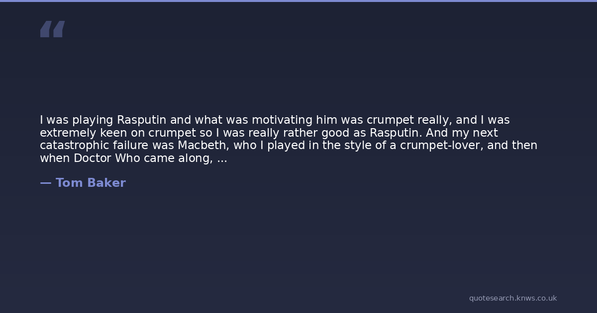 I was playing Rasputin and what was motivating him was crumpet really, and I was extremely keen on crumpet so I was really rather good as Rasputin. And my next catastrophic failure was Macbeth, who I played in the style of a crumpet-lover, and then when Doctor Who came along, I embraced this lunacy, this cloud-cuckoo-land where people had to be convinced by absolute nonsense. I came from a very religious background, so it was easy for me to believe in something I knew nothing about.