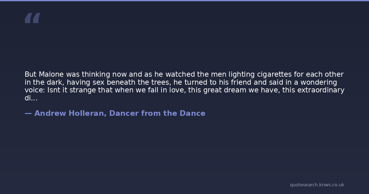 But Malone was thinking now and as he watched the men lighting cigarettes for each other in the dark, having sex beneath the trees, he turned to his friend and said in a wondering voice: Isnt it strange that when we fall in love, this great dream we have, this extraordinary disease, the only thing in which either one of us is interested, its inevitably with some perfectly ordinary drip who for some reason we cannot define is the magic bearer, the magician, the one who brings all this to us. Why?