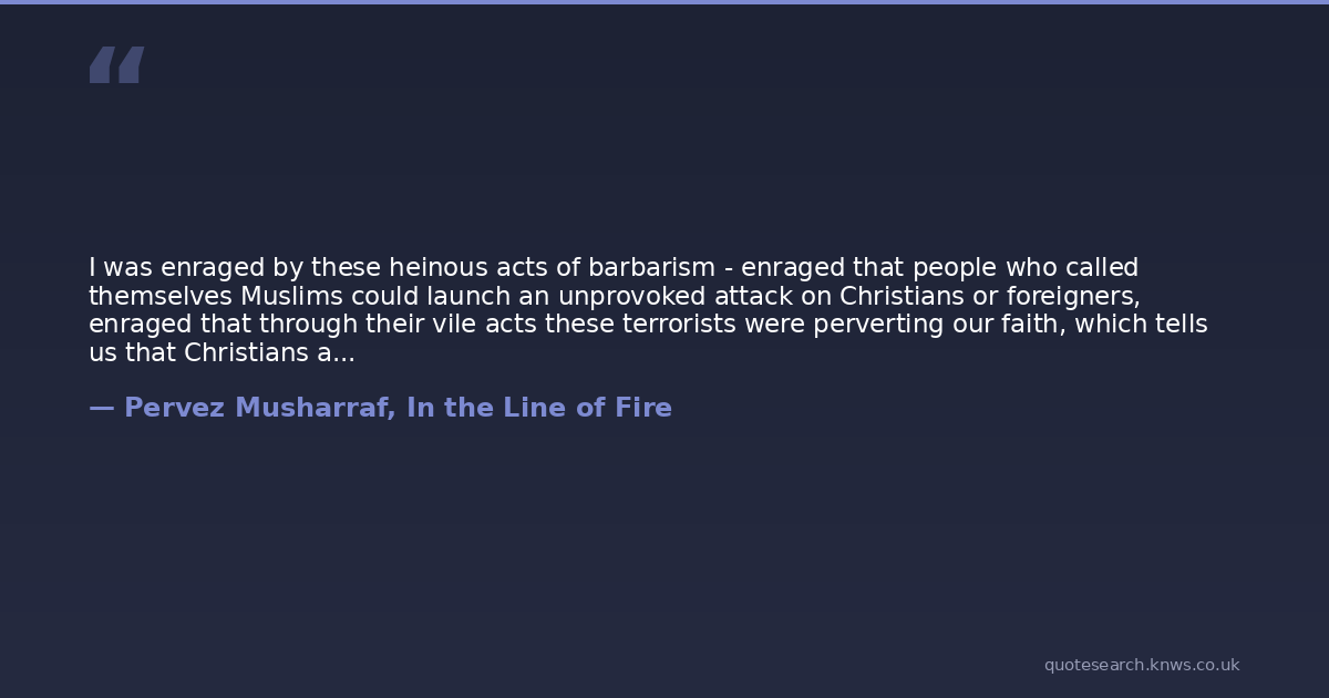 I was enraged by these heinous acts of barbarism - enraged that people who called themselves Muslims could launch an unprovoked attack on Christians or foreigners, enraged that through their vile acts these terrorists were perverting our faith, which tells us that Christians are among the "people of the Book", that we should show discernment when fighting for the cause of God and not fight those who have not harmed us, that murder and suicide are grievous sins.