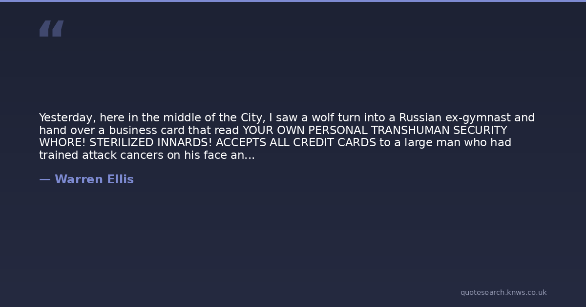 Yesterday, here in the middle of the City, I saw a wolf turn into a Russian ex-gymnast and hand over a business card that read YOUR OWN PERSONAL TRANSHUMAN SECURITY WHORE! STERILIZED INNARDS! ACCEPTS ALL CREDIT CARDS to a large man who had trained attack cancers on his face and possessed seventy-five indentured Komodo Dragons instead of legs. And they had sex. Right in front of me. And six of the Komodo Dragons spat napalm on my new shoes.