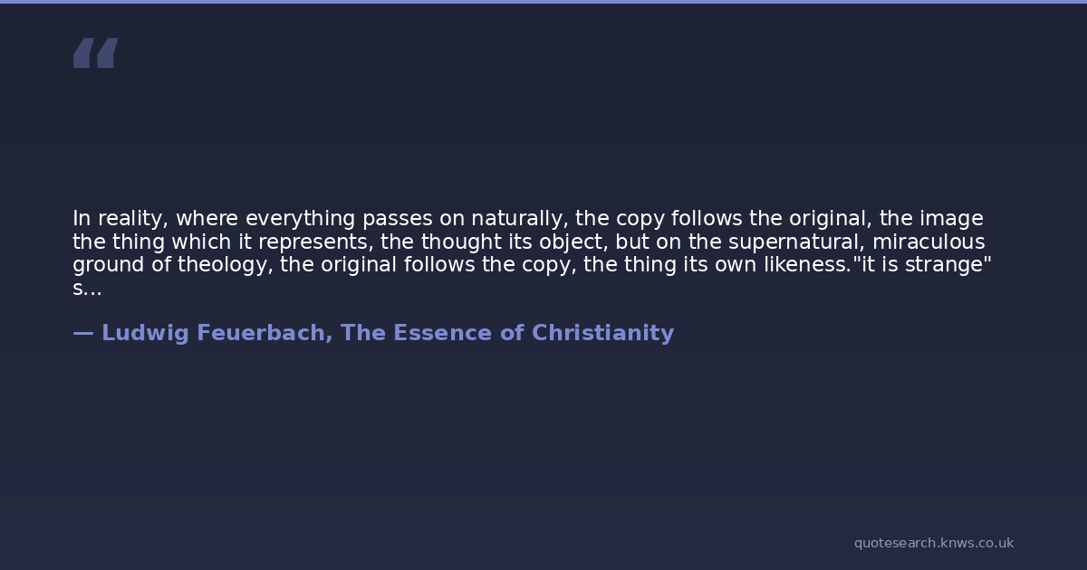 In reality, where everything passes on naturally, the copy follows the original, the image the thing which it represents, the thought its object, but on the supernatural, miraculous ground of theology, the original follows the copy, the thing its own likeness."it is strange" says St. Augustine, "But nevertheless true, that this world could not exist if it was not known to God." That means the world is known and thought before it exists; nay it exists only because it was thought of. The existence is a consequence of the knowledge or of the act of thinking, the original a consequence of the copy, the object a consequence of its likeness.