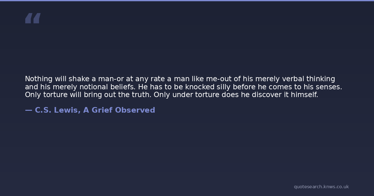 Nothing will shake a man-or at any rate a man like me-out of his merely verbal thinking and his merely notional beliefs. He has to be knocked silly before he comes to his senses. Only torture will bring out the truth. Only under torture does he discover it himself.