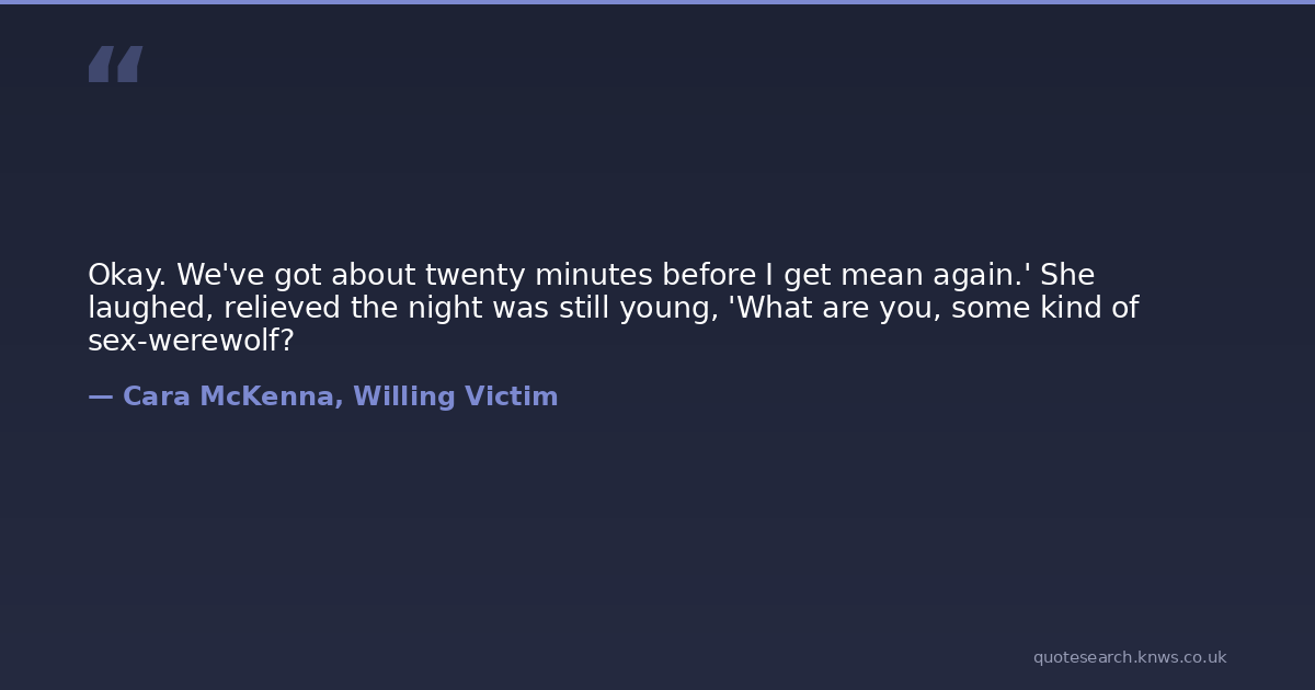 Okay. We've got about twenty minutes before I get mean again.' She laughed, relieved the night was still young, 'What are you, some kind of sex-werewolf?