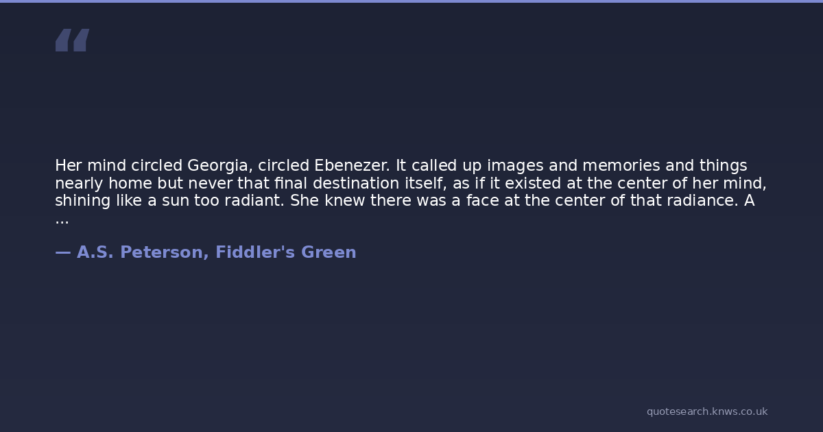 Her mind circled Georgia, circled Ebenezer. It called up images and memories and things nearly home but never that final destination itself, as if it existed at the center of her mind, shining like a sun too radiant. She knew there was a face at the center of that radiance. A face too bright. A face she sought and longed for but could no longer bear the light of. She drifted into sleep, circling, circling, circling.