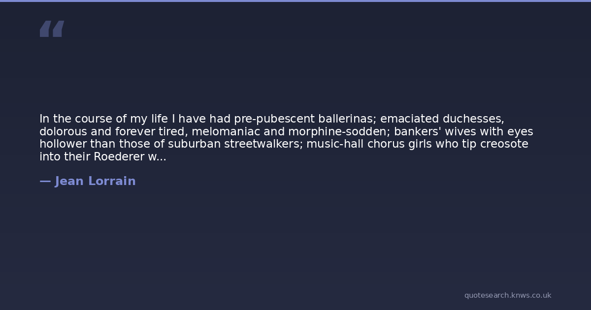Jean Lorrain was French poet and novelist. Jean Lorrain, born Paul Alexandre Martin Duval, was a French poet and novelist of the Symbolist school. Read more on Wikipedia →