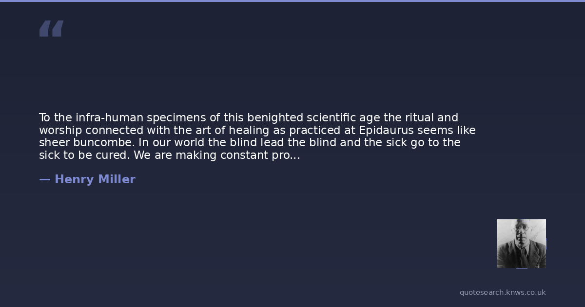 To the infra-human specimens of this benighted scientific age the ritual and worship connected with the art of healing as practiced at Epidaurus seems like sheer buncombe. In our world the blind lead the blind and the sick go to the sick to be cured. We are making constant progress, but it is a progress which leads to the operating table, to the poor house, to the insane asylum, to the trenches. We have no healers we have only butchers whose knowledge of anatomy entitles them to a diploma, which in turn entitles them to carve out or amputate our illnesses so that we may carry on in cripple fashion until such time as we are fit for the slaughterhouse. We announce the discovery of this cure and that but make no mention of the new diseases which we have created en route. The medical cult operates very much like the war office the triumphs which they broadcast are sops thrown out to conceal death and disaster. The medicos, like the military authorities, are helpless; they are waging a hopeless fight from the start. What man wants is peace in order that he may live. Defeating our neighbor doesnt give peace any more than curing cancer brings health. Man doesnt begin to live through triumphing over his enemy nor does he begin to acquire health through endless cures. The joy of life comes through peace, which is not static but dynamic. No man can really say that he knows what joy is until he has experienced peace. And without joy there is no life, even if you have a dozen cars, six butlers, a castle, a private chapel and a bomb-proof vault. Our diseases are our attachments, be they habits, ideologies, ideals, principles, possessions, phobias, gods, cults, religions, what you please. Good wages can be a disease just as much as bad wages. Leisure can be just as great a disease as work. Whatever we cling to, even if it be hope or faith, can be the disease which carries us off. Surrender is absolute: if you cling to even the tiniest crumb you nourish the germ which will devour you. As for clinging to God, God long ago abandoned us in order that we might realize the joy of attaining godhood through our own efforts. All this whimpering that is going on in the dark, this insistent, piteous plea for peace which will grow bigger as the pain and the misery increase, where is it to be found? Peace, do people imagine that it is something to cornered, like corn or wheat? Is it something which can be pounded upon and devoured, as with wolves fighting over a carcass? I hear people talking about peace and their faces are clouded with anger or with hatred or with scorn and disdain, with pride and arrogance. There are people who want to fight to bring about peace- the most deluded souls of all. There will be no peace until murder is eliminated from the heart and mind. Murder is the apex of the broad pyramid whose base is the self. That which stands will have to fall. Everything which man has fought for will have to be relinquished before he can begin to live as man. Up till now he has been a sick beast and even his divinity stinks. He is master of many worlds and in his own he is a slave. What rules the world is the heart, not the brain, in every realm our conquests bring only death. We have turned our backs on the one realm wherein freedom lies. At Epidaurus, in the stillness, in the great peace that came over me, I heard the heart of the world beat. I know what the cure is: it is to give up, to relinquish, to surrender, so that our little hearts may beat in unison with the great heart of the world.