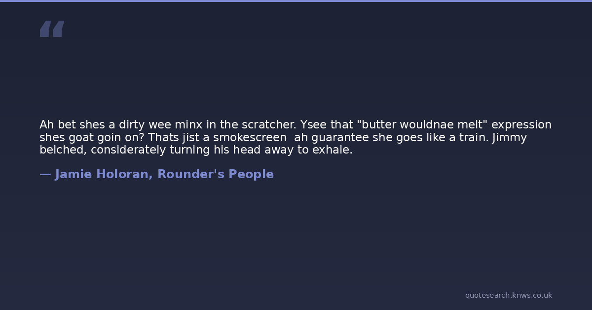 Ah bet shes a dirty wee minx in the scratcher. Ysee that "butter wouldnae melt" expression shes goat goin on? Thats jist a smokescreen ah guarantee she goes like a train. Jimmy belched, considerately turning his head away to exhale.