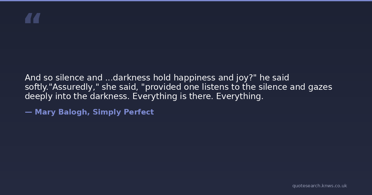 And so silence and ...darkness hold happiness and joy?" he said softly."Assuredly," she said, "provided one listens to the silence and gazes deeply into the darkness. Everything is there. Everything.