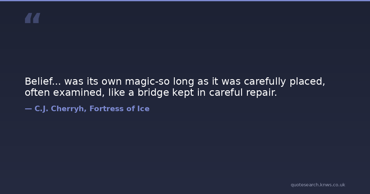Belief... was its own magic-so long as it was carefully placed, often examined, like a bridge kept in careful repair. belief Download Image Share on X Share on Facebook Copy Link