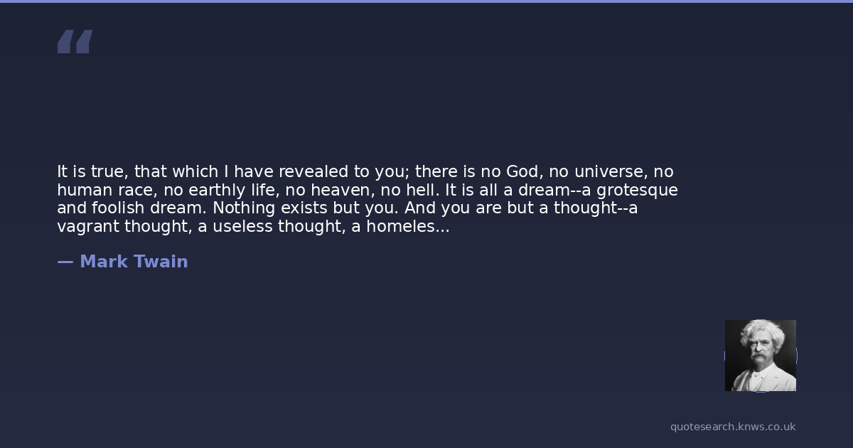 It is true, that which I have revealed to you; there is no God, no universe, no human race, no earthly life, no heaven, no hell. It is all a dream--a grotesque and foolish dream. Nothing exists but you. And you are but a thought--a vagrant thought, a useless thought, a homeless thought, wandering forlorn among the empty eternities!
