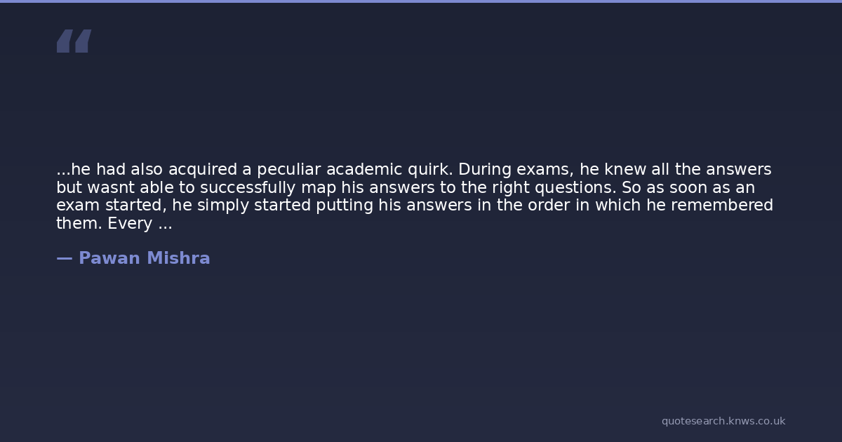 ...he had also acquired a peculiar academic quirk. During exams, he knew all the answers but wasnt able to successfully map his answers to the right questions. So as soon as an exam started, he simply started putting his answers in the order in which he remembered them. Every time he moved to a new class, his parents made the new teachers aware of this snag. The teachers acknowledged it and reassured the parents that theyd match his answers against the appropriate questions.
