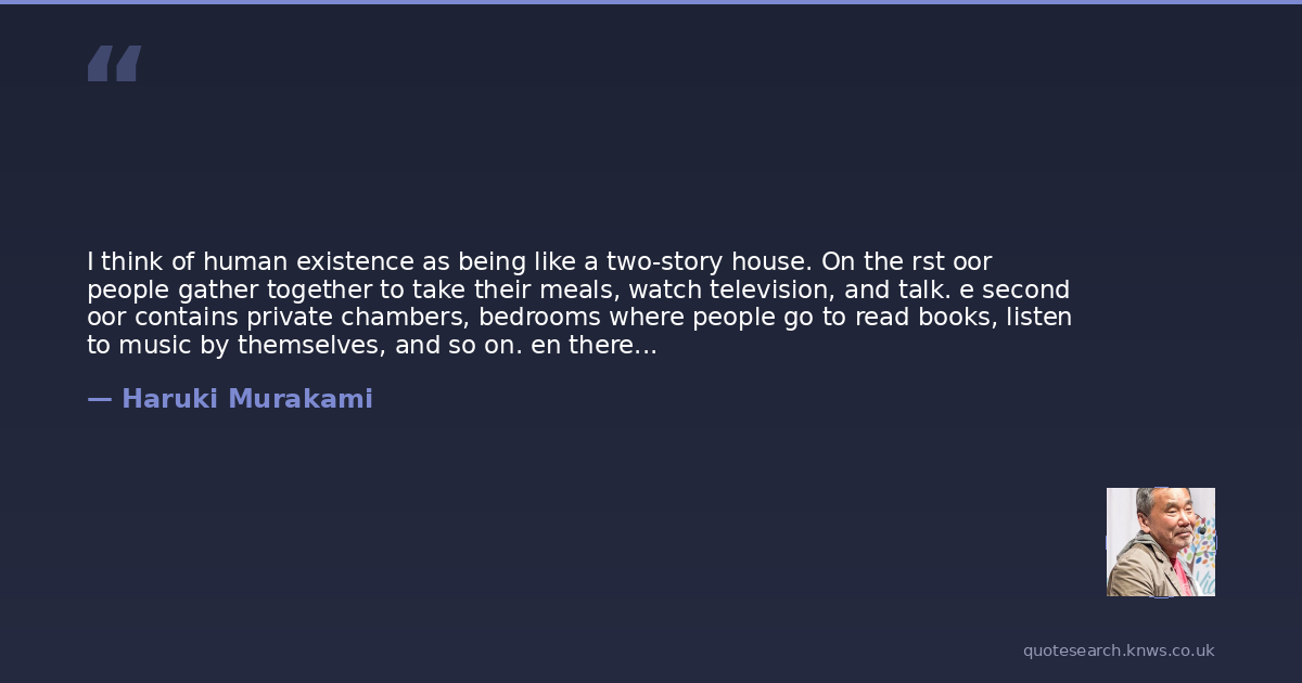 I think of human existence as being like a two-story house. On the rst oor people gather together to take their meals, watch television, and talk. e second oor contains private chambers, bedrooms where people go to read books, listen to music by themselves, and so on. en there is a basement;this is a special place, and there are a number of things stored here. We dont use this room much in our daily life, but some- times we come in, vaguely hang around the place. en, my thought is that underneath that basement room is yet another basement room. is one has a very special door, very di - cult to gure out, and normally you cant get in theresome people never get in at all. . . . You go in, wander about in the darkness, and experience things there you wouldnt see in the normal parts of the house. You connect with your past there, because you have entered into your own soul. But then you come back. If you stay over there for long you can never get back to reality.