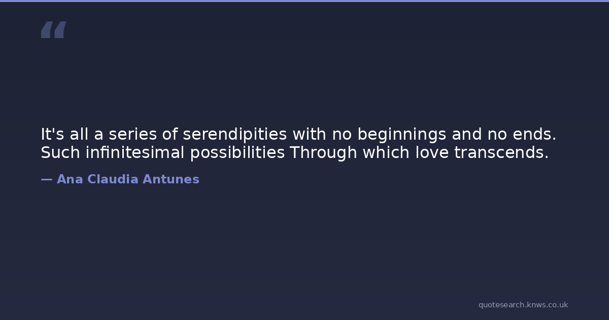 It's all a series of serendipities with no beginnings and no ends. Such infinitesimal possibilities Through which love transcends.