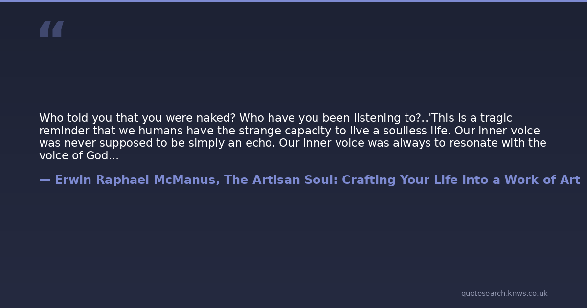 Who told you that you were naked? Who have you been listening to?..'This is a tragic reminder that we humans have the strange capacity to live a soulless life. Our inner voice was never supposed to be simply an echo. Our inner voice was always to resonate with the voice of God. Every other voice will either make us less than we were intended to be or convince us that we are more than we really are. Neither self-loathing nor self-worship helps us find our authentic voice. It is only when our inner voice responds to the voice of God that we begin to truly find to find our own voice. As critical as it is for us to understand that art is always an extension of ourselves, the creative act is also an expression of our essence. It is equally important for us to realize that our guiding narrative determines the story we tell through our lives. Our inner voice not only informs us of who we are, but affects everything we touch. And in the end, becomes the driving force through which we strive to shape the world around us. The principal creative act described in Genesis chapter 1 begins with God speaking the universe into existence. God speaks out of who He is and everything in creation is a declaration of His glory.