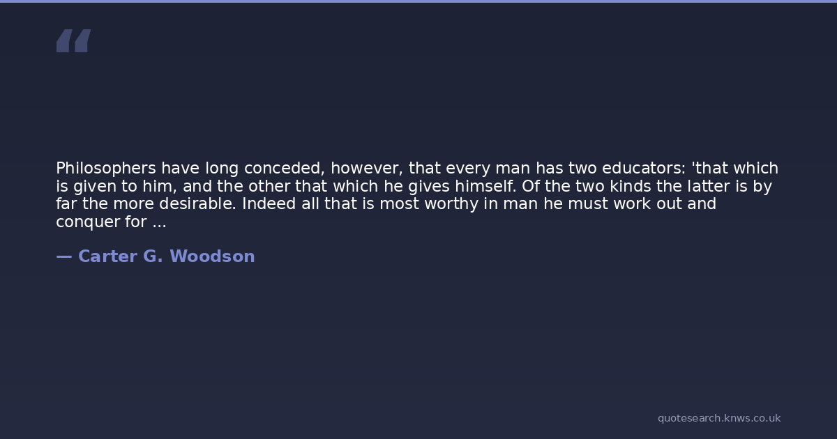 Philosophers have long conceded, however, that every man has two educators: 'that which is given to him, and the other that which he gives himself. Of the two kinds the latter is by far the more desirable. Indeed all that is most worthy in man he must work out and conquer for himself. It is that which constitutes our real and best nourishment. What we are merely taught seldom nourishes the mind like that which we teach ourselves.