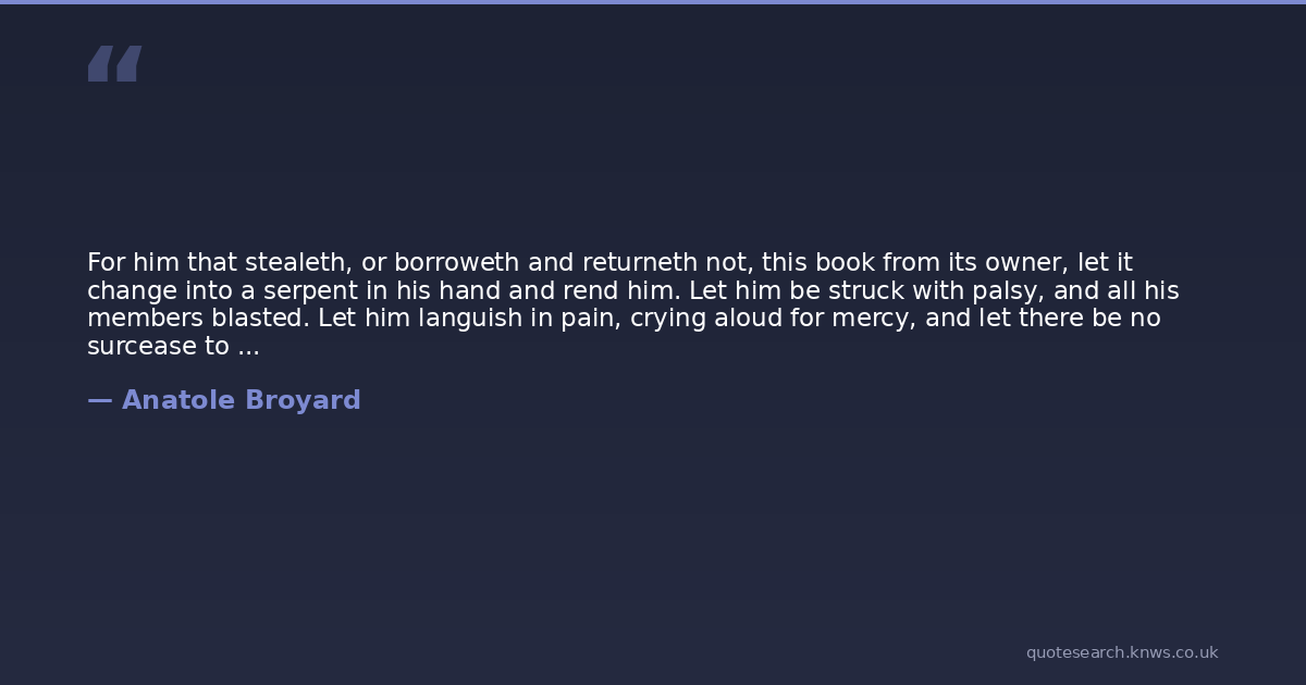 For him that stealeth, or borroweth and returneth not, this book from its owner, let it change into a serpent in his hand and rend him. Let him be struck with palsy, and all his members blasted. Let him languish in pain, crying aloud for mercy, and let there be no surcease to this agony till he sing in dissolution. Let bookworms gnaw his entrailsand when at last he goeth to his final punishment, let the flames of Hell consume him forever. Anonymous Curse on Book Theives from the Monaster of San Pedro, Barcelona, Spain