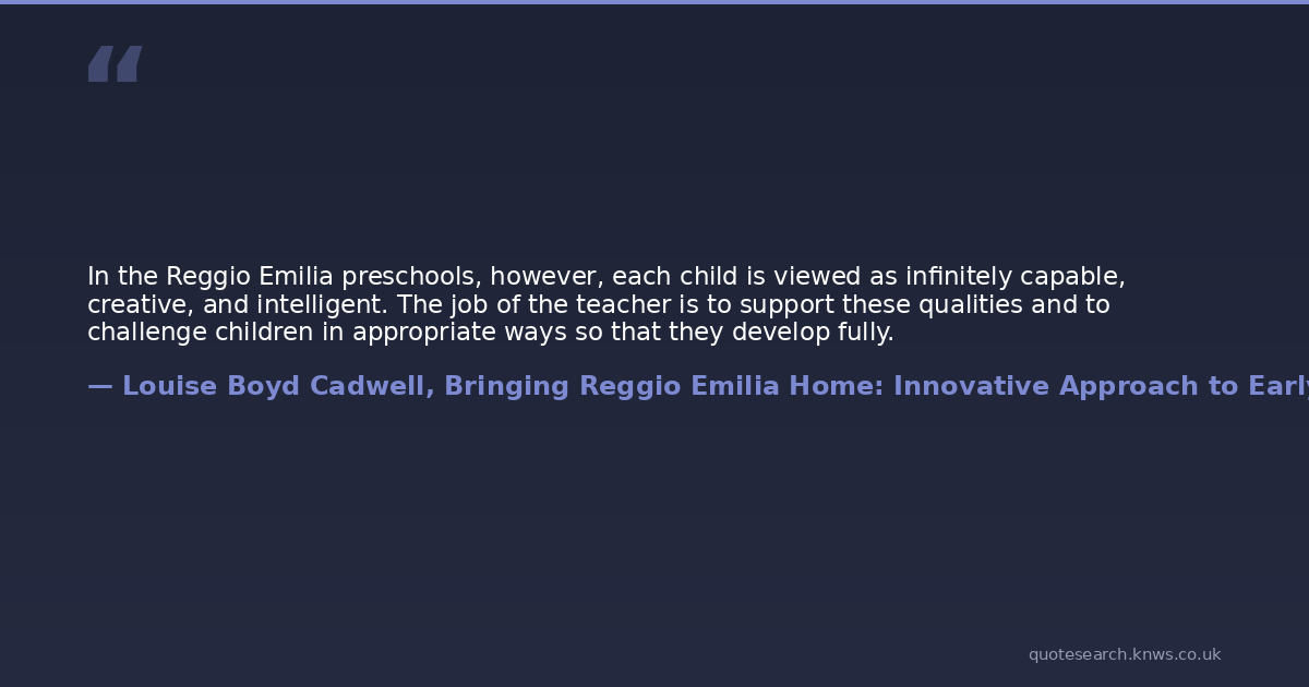 In the Reggio Emilia preschools, however, each child is viewed as infinitely capable, creative, and intelligent. The job of the teacher is to support these qualities and to challenge children in appropriate ways so that they develop fully.