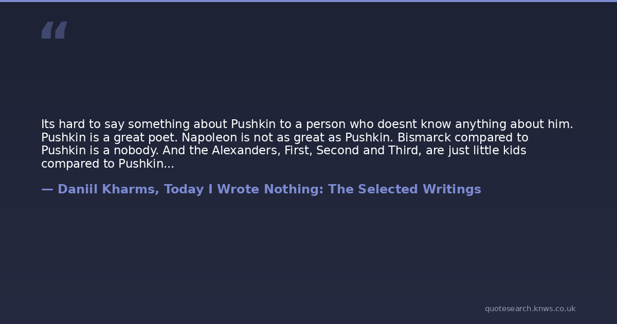 Its hard to say something about Pushkin to a person who doesnt know anything about him. Pushkin is a great poet. Napoleon is not as great as Pushkin. Bismarck compared to Pushkin is a nobody. And the Alexanders, First, Second and Third, are just little kids compared to Pushkin. In fact, compared to Pushkin, all people are little kids, except Gogol. Compared to him, Pushkin is a little kid.And so, instead of writing about Pushkin, I would rather write about Gogol.Although, Gogol is so great that not a thing can be written about him, so I'll write about Pushkin after all.Yet, after Gogol, its a shame to have to write about Pushkin. But you cant write anything about Gogol. So Id rather not write anything about anyone.