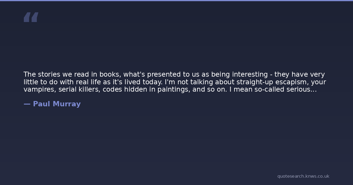 The stories we read in books, what's presented to us as being interesting - they have very little to do with real life as it's lived today. I'm not talking about straight-up escapism, your vampires, serial killers, codes hidden in paintings, and so on. I mean so-called serious literature. A boy goes hunting with his emotionally volatile father, a bereaved woman befriends an asylum seeker, a composer with a rare neurological disorder walks around New York, thinking about the nature of art. People looking back over their lives, people having revelations, people discovering meaning. Meaning, that's the big thing. The way these books have it, you trip over a rock you'll find some hidden meaning waiting there. Everyone's constantly on the verge of some soul-shaking transformation. And it's - if you'll forgive my language - it's bullshit. Modern people live in a state of distraction. They go from one distraction to the next, and that's how they like it. They don't transform, they don't stop to smell the roses, they don't sit around recollecting long passages of their childhood - Jesus, I can hardly remember what I was doing two days ago. My point is, people aren't waiting to be restored to some ineffable moment. They're not looking for meaning. That whole idea of the novel - that's finished.