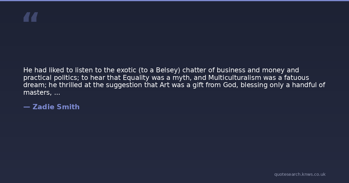 He had liked to listen to the exotic (to a Belsey) chatter of business and money and practical politics; to hear that Equality was a myth, and Multiculturalism was a fatuous dream; he thrilled at the suggestion that Art was a gift from God, blessing only a handful of masters, and most Literature merely a veil for poorly reasoned left-wing ideologies.