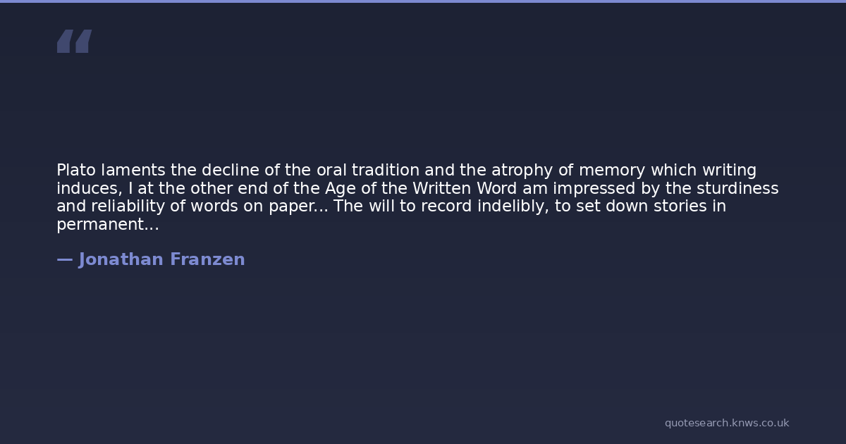 Plato laments the decline of the oral tradition and the atrophy of memory which writing induces, I at the other end of the Age of the Written Word am impressed by the sturdiness and reliability of words on paper... The will to record indelibly, to set down stories in permanent words, seems to me akin to the conviction that we are larger than our biologies.