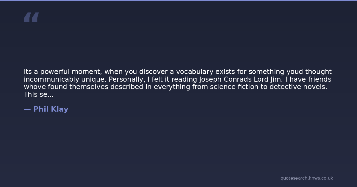 Its a powerful moment, when you discover a vocabulary exists for something youd thought incommunicably unique. Personally, I felt it reading Joseph Conrads Lord Jim. I have friends whove found themselves described in everything from science fiction to detective novels. This self-recognition through others is not simply a by-product of art its the whole point.