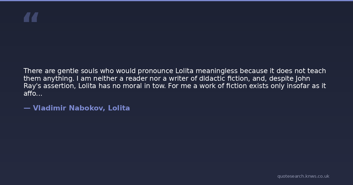 There are gentle souls who would pronounce Lolita meaningless because it does not teach them anything. I am neither a reader nor a writer of didactic fiction, and, despite John Ray's assertion, Lolita has no moral in tow. For me a work of fiction exists only insofar as it affords me what I shall bluntly call aesthetic bliss, that is a sense of being somehow, somewhere, connected with other states of being where art (curiosity, tenderness, kindness, ecstasy) is the norm. There are not many such books. All the rest is either topical trash or what some call the Literature of Ideas, which very often is topical trash coming in huge blocks of plaster that are carefully transmitted from age to age until somebody comes along with a hammer and takes a good crack at Balzac, at Gorki, at Mann.