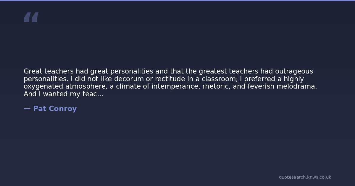 Great teachers had great personalities and that the greatest teachers had outrageous personalities. I did not like decorum or rectitude in a classroom; I preferred a highly oxygenated atmosphere, a climate of intemperance, rhetoric, and feverish melodrama. And I wanted my teachers to make me smart. A great teacher is my adversary, my conqueror, commissioned to chastise me. He leaves me tame and grateful for the new language he has purloined from other kings whose granaries are filled and whose libraries are famous. He tells me that teaching is the art of theft: of knowing what to steal and from whom. Bad teachers do not touch me; the great ones never leave me. They ride with me during all my days, and I pass on to others what they have imparted to me. I exchange their handy gifts with strangers on trains, and I pretend the gifts are mine. I steal from the great teachers. And the truly wonderful thing about them is they would applaud my theft, laugh at the thought of it, realizing they had taught me their larcenous skills well.