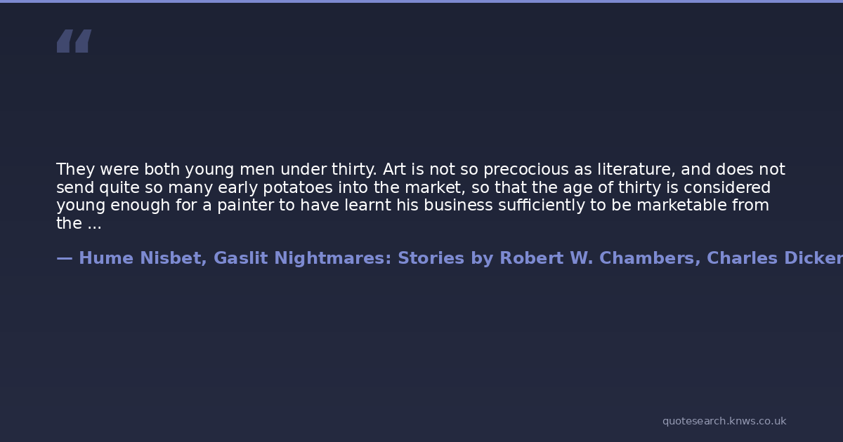 They were both young men under thirty. Art is not so precocious as literature, and does not send quite so many early potatoes into the market, so that the age of thirty is considered young enough for a painter to have learnt his business sufficiently to be marketable from the picture-dealing point of view. ("The Phantom Model")