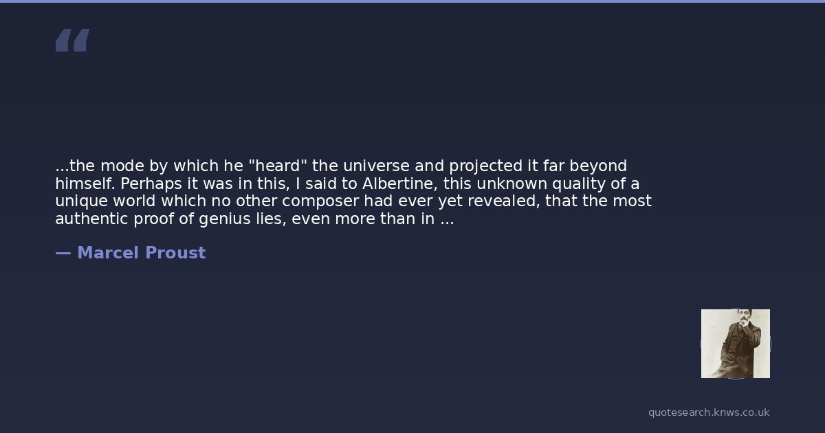...the mode by which he "heard" the universe and projected it far beyond himself. Perhaps it was in this, I said to Albertine, this unknown quality of a unique world which no other composer had ever yet revealed, that the most authentic proof of genius lies, even more than in the content of the work itself. "Even in literature? Albertine inquired. Even in literature. And thinking again of the sameness of Vinteuils works, I explained to Albertine that the great men of letters have never created more than a single work, or rather have never done more than refract through various media an identical beauty which they bring into the world. If it were not so late, my sweet, I said to her, I would show you this quality in all the writers whose works you read while Im asleep, I would show you the same identity as in Vinteuil. These key-phrases, which you are beginning to recognise as I do, my little Albertine, the same in the sonata, in the septet, in the other works, would be, say for instance in Barbey dAurevilly, a hidden reality revealed by a physical sign, the physiological blush...